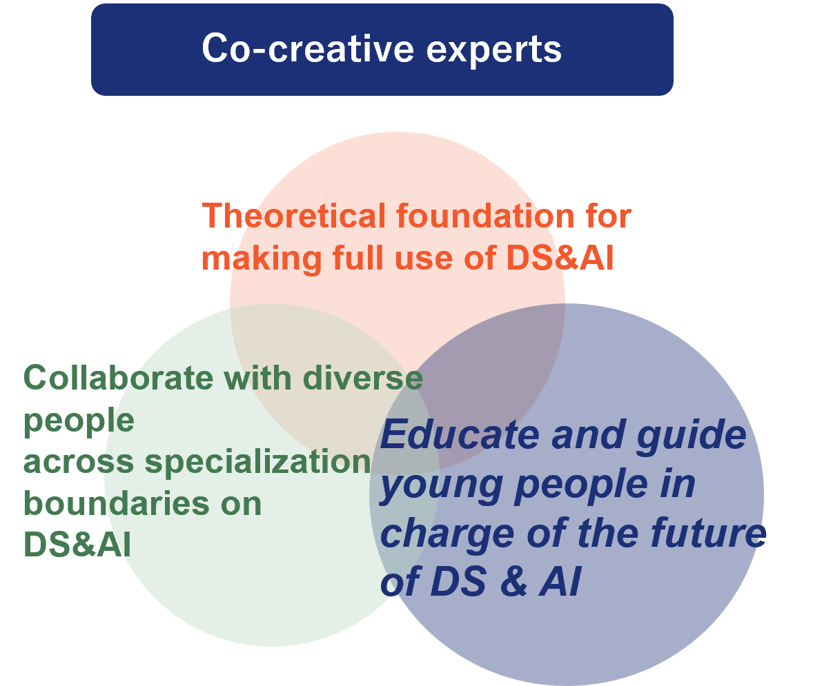 The university-wide educational programs operated by the Center for Data Science and Artificial Intelligence Education aim to cultivate “co-creative experts” who can ①make full use of DS & AI, ➁collaborate using DS & AI, ③educate and guide others in DS & AI.