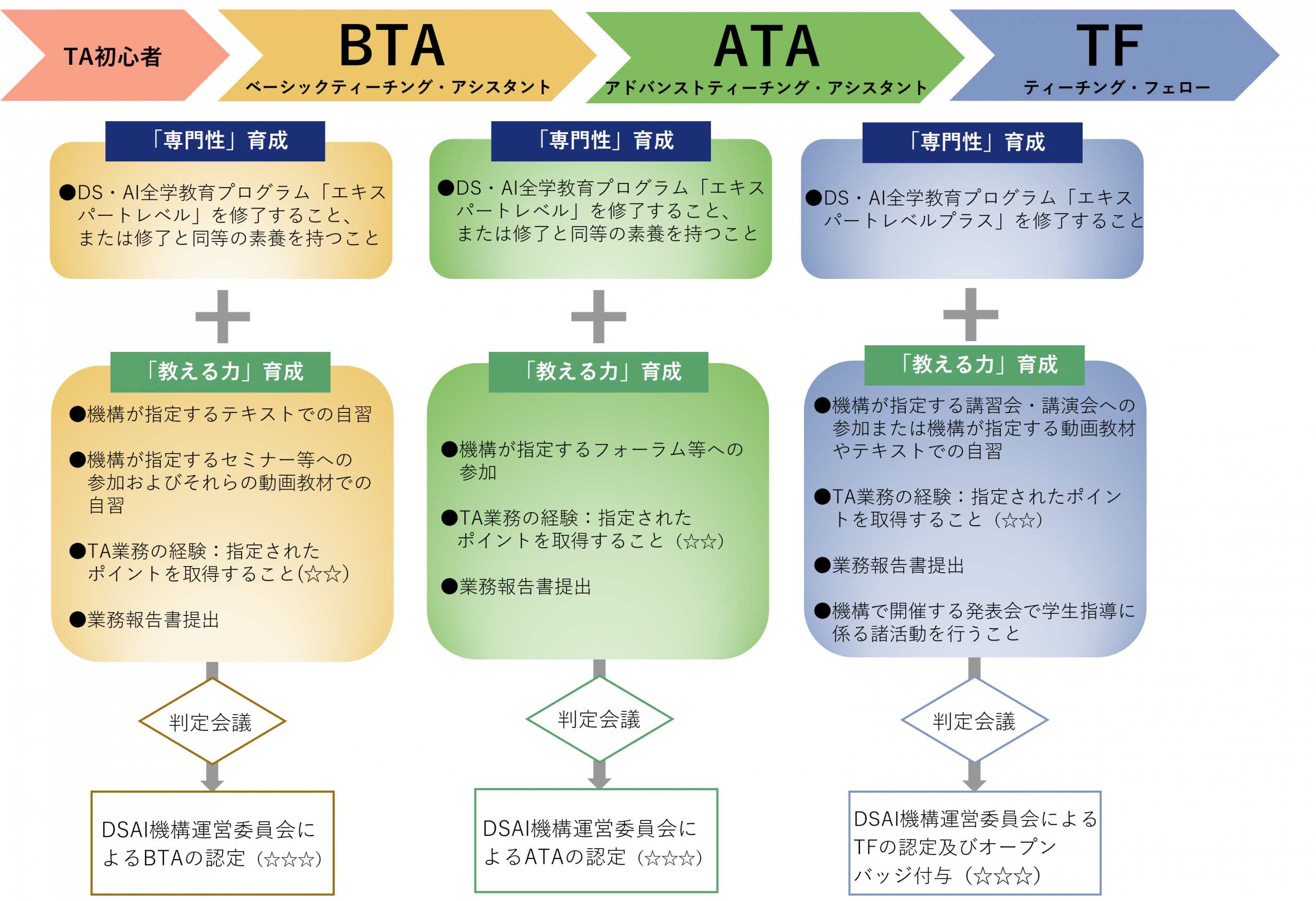 DS・AIの専門性に加えて授業TAを通じて教える力を身につけ、授業を担当できるレベルの人材(ティーチング・フェロー)となることを目的とします。