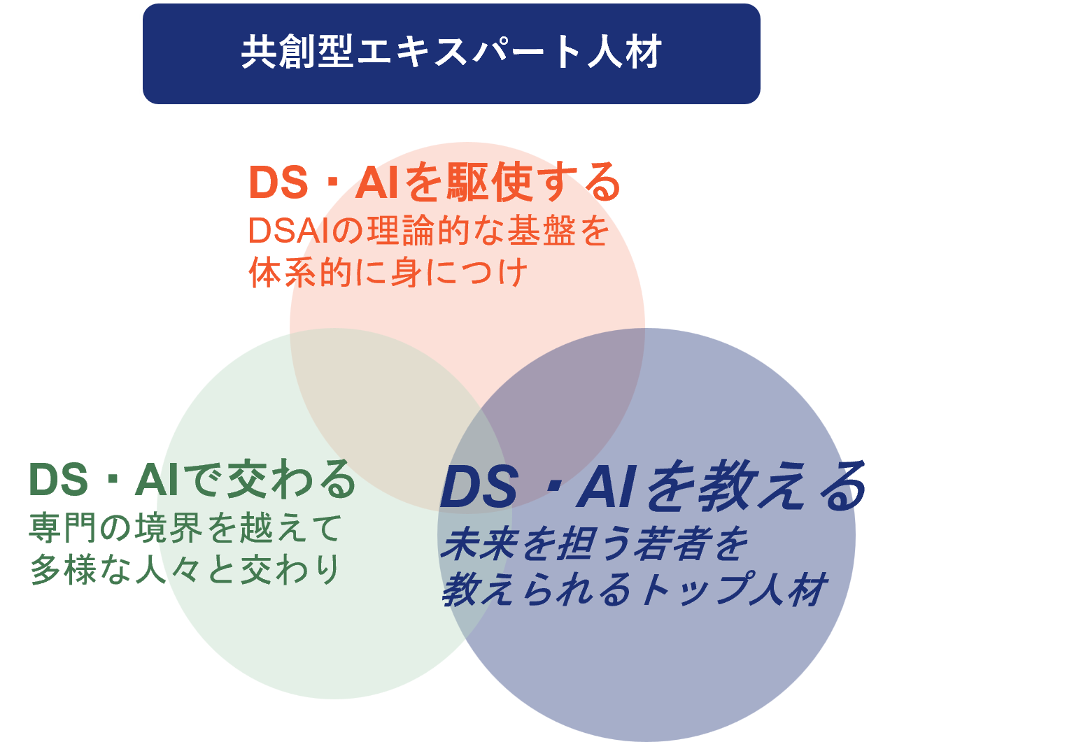 本機構の教育プログラムは、①DS・AIを駆使し、➁DS・AIで交わり、③DS・AIを教えることのできる「共創型エキスパート」人材の育成を目指しています。その中でも特に③「DS・AIを教える」能力を涵養するため、2024年度よりティーチング・フェロー(TF)育成プログラムを実施しています。高度な「専門性」と「教える力」を同時に学び、最終段階では授業を担当できるレベルとなります。
